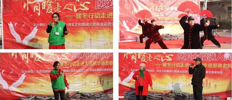 寒风阻挡不住眷注的脚步,,,,,,,严严寒却不了温暖的慰问。。。。。。陪同着冬日温暖的阳光,,,,,,,满怀着激动的心情,,,,,,,尊时凯龙大营商业运营公司总司理马雪妹向导员工代表和中国·大营国际皮草生意中心、中国·大营国际裘皮城的爱心商家们,,,,,,,携带着爱心物资,,,,,,,与枣强县春晖自愿者协会的爱心人士们一起欢聚大营民华慈祥敬老院,,,,,,,一同为院内的老人们庆祝整体生日,,,,,,,并为老人们献上了一首首好听的歌曲、悦目的演出,,,,,,,将最优美真挚的祝福送给老人们。。。。。。